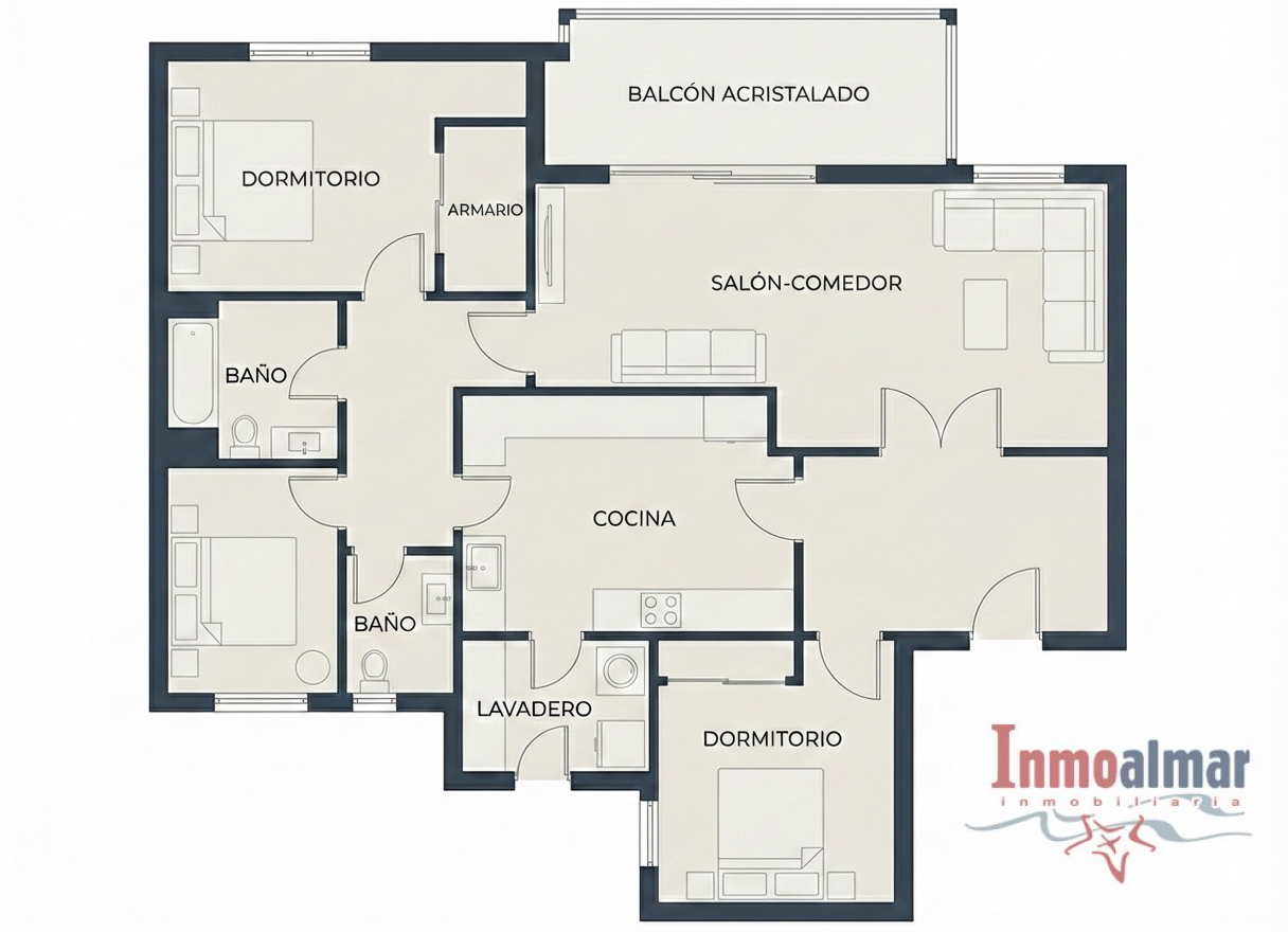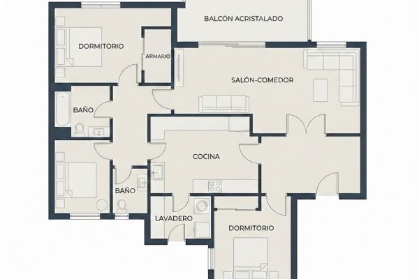 La vivienda cuenta con tres dormitorios, dos baños, cocina independiente con lavadero y acceso a un patio exterior comunitario. Además, dispone de una terraza acristalada, soleada y muy luminosa, que aporta gran luz natural a la vivienda.